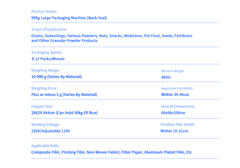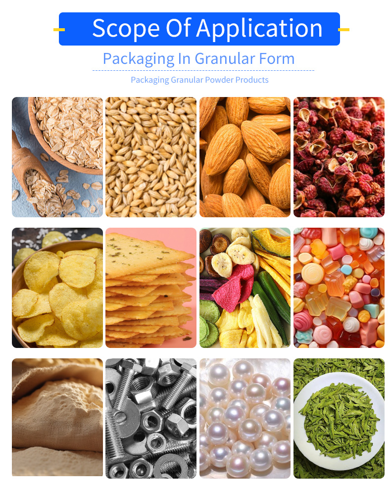 Application Scope: Grains, seasonings, various powders, nuts, snacks, pharmaceuticals, pet feed, seeds, fertilizers, and other granular or powdered products